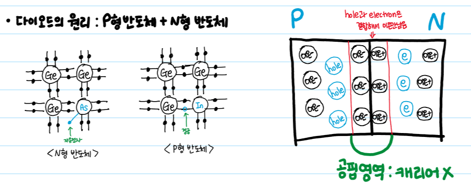 다이오드는 PN접합, 즉 P형 반도체와 N형 반도체의 접합으로 이루어져 있습니다.
