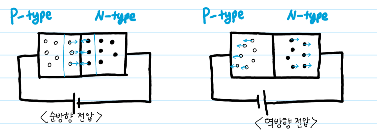 이러한 PN접합 다이오드에 순방향 전압을 걸게 되면