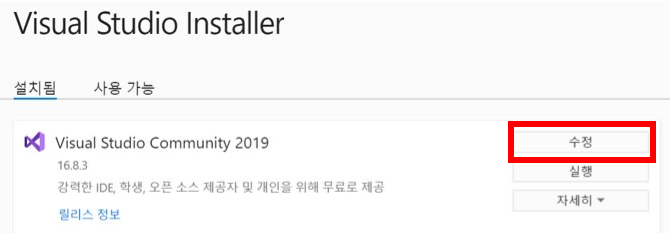 우선 Visual Studio Installer를 실행시켜줍니다.