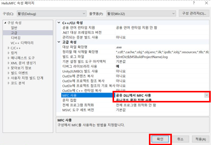 우선 저는 HelloMFC라는 프로젝트를 만들었습니다.
