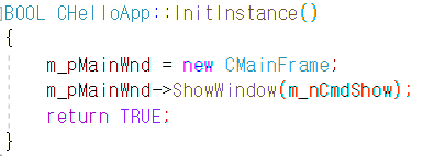 위의 소스코드를 보시면 메인 윈도우의 기능을 가지는 CMainFrame 객체를 생성하고 ShowWindow() 멤버 함수를 호출해서 윈도우를 화면에 나타냅니다.