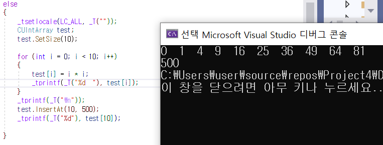 InsertAt이라는 함수를 괜히 사용해보고 싶어서 10번 인덱스의 값을 500으로 바꾼 후 출력 또한 해보았습니다.