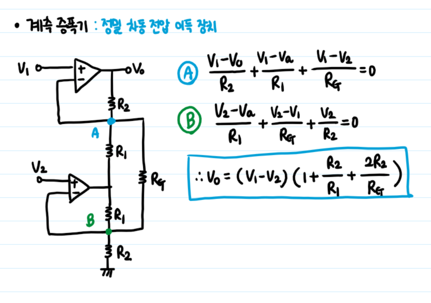 계측 증폭기는 3개의 연산 증폭기로 구성되어 있습니다.