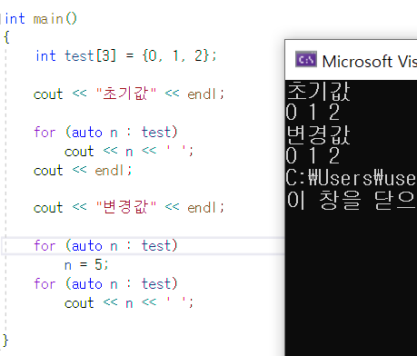 | for(auto 요소변수 : 배열이름) 반복구문; |