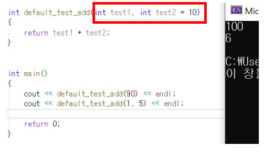 즉 이와 같이 매개변수에 디폴트 값을 선언해준 함수는 호출할 때 실인수를 생략한 채 호출할 수 있다는 것이 바로 디폴트 매개변수의 개념입니다.