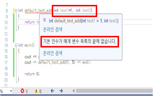 기본 인수가 매개 변수 목록의 끝에 없다는 오류가 나타나는 것을 확인할 수 있습니다.