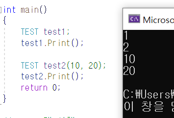 TEST 객체를 생성하여 TEST 클래스의 생성자 함수가 호출된 것을 확인할 수 있습니다.