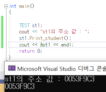 this를 이용해서 출력한 값과 &st1의 값이 같은 것을 알 수 있습니다.