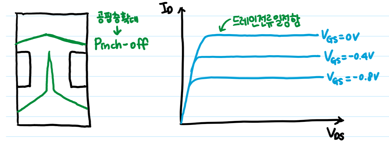 핀치오프가 된 시점부터는 드레인 소스 전압을 높일지라도 일정한 전류가 흐르게 됩니다.