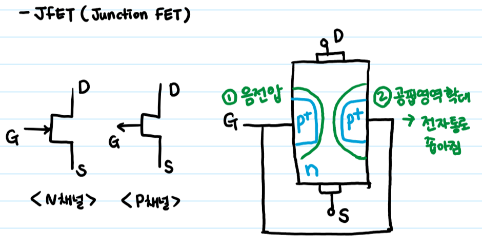 N타입 JFET는 약하게 도핑된 N형 반도체에 P형 반도체 2개가 양옆에 삽입이 되어있는 형태입니다.