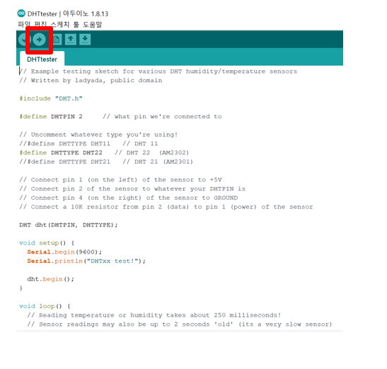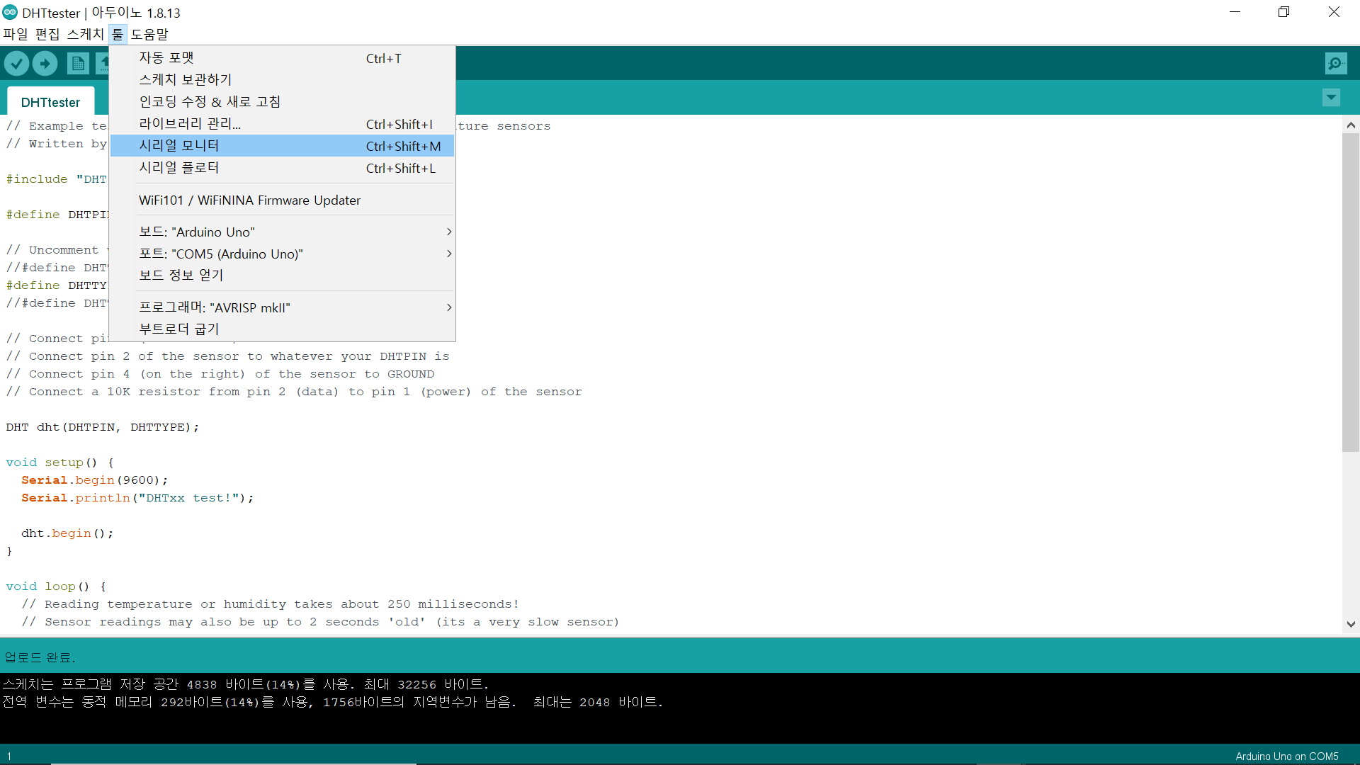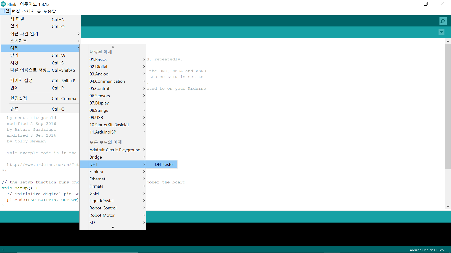 4) 파일-예제-DHT-DHT Tester를 클릭해줍니다.