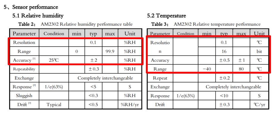 습도의 경우 측정 범위가 0~99.9%이며 0.1%의 해상도를 갖고 있습니다. 정확도는 2%내외임을 알 수 있습니다.