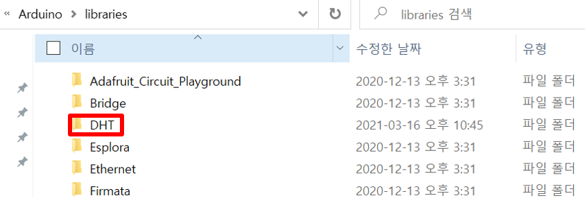 2) 압축을 푼 DHT파일을 복사하여 Arduino-libraries에 붙여넣기 해줍니다.