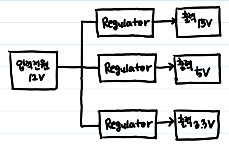 그림처럼 12V의 전원을 레귤레이터를 통해 강압 또는 승압을 하여 원하는 출력을 뽑아냅니다.
