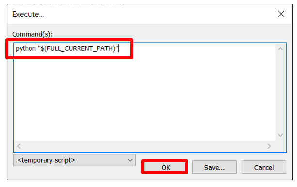 4) python "$(FULL_CURRENT_PATH)"를 입력하고 OK 버튼을 클릭합니다.