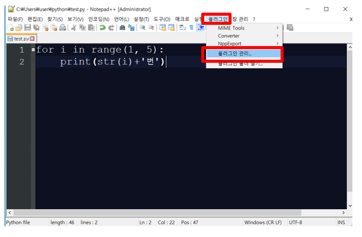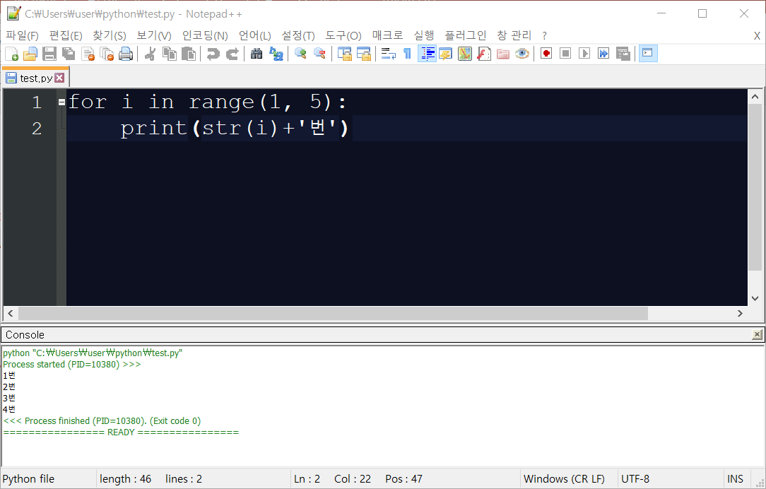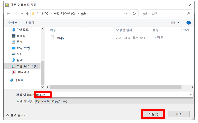 Notepad++로 작성한 소스코드를 test.py라는 이름과 확장자로 저장을 해줍니다.