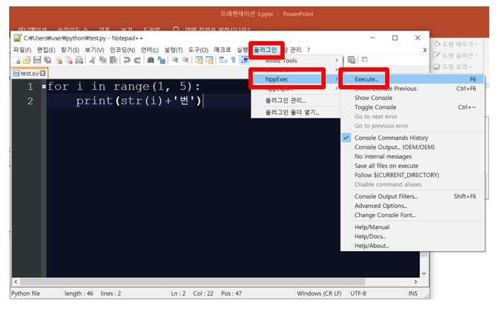 3) 플러그인 - NppExec - Execute를 클릭합니다.