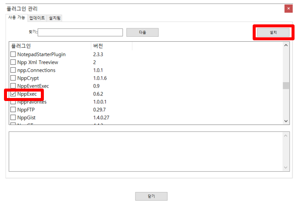 2) NppExec에 체크박스를 체크해주고 설치 버튼을 클릭합니다.
