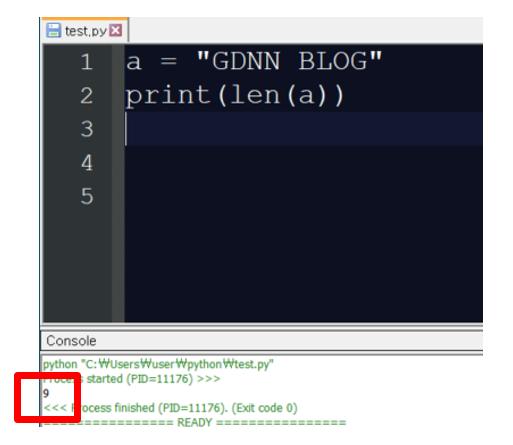 GDNN BLOG라는 문자열의 길이를 출력해 보았더니 공백까지 포함해서 9인 것을 알 수 있습니다.