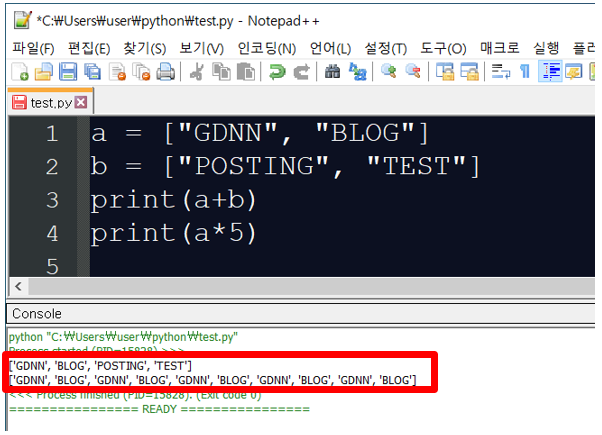 a 리스트와 b 리스트를 더한 것을 출력해보니 두 리스트가 합쳐진 것을 확인할 수 있습니다.
