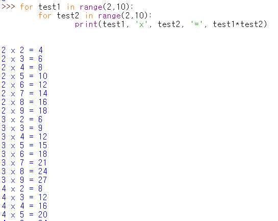 파이썬에서는 이렇게 간단하게 곱셈표를 만들 수 있습니다.