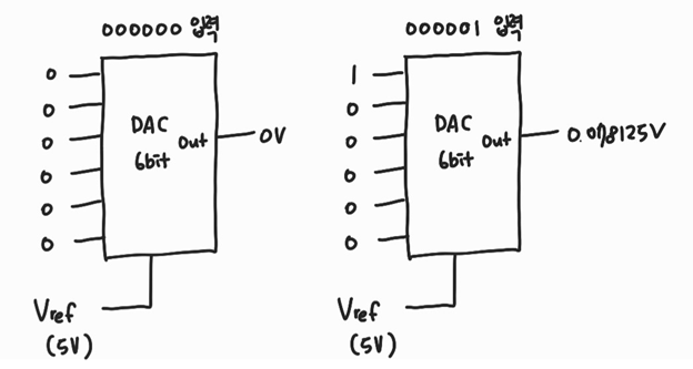 이때 마찬가지로 000000을 입력하게 되면 0V가 출력이 될 것이고 000001을 입력하면 0.078125V가 출력이 됩니다.