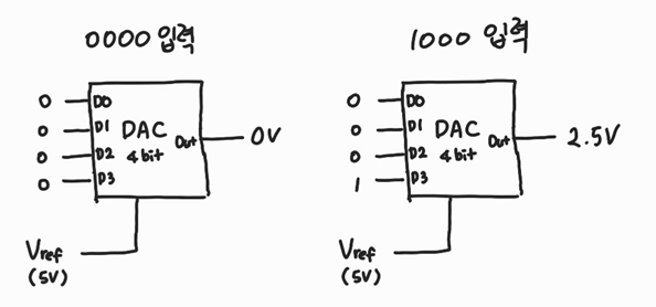 만약에 기준 전압을 10V에 4비트 분해능을 가지는 DAC라면 0.625V 간격으로 Output을 조절할 수 있게 됩니다.