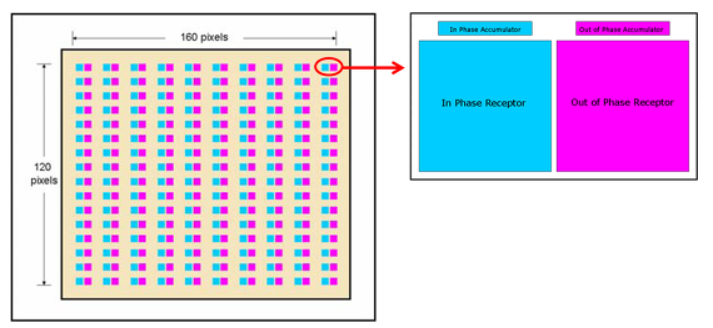 TOF 카메라의 이미지 센서는 각각의 셀이 2개의 Receptor 쌍으로 구성되어 있습니다.
