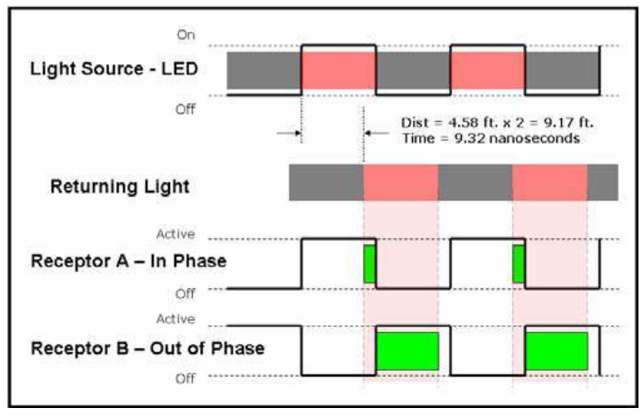 이러한 경우 빛이 갔다가 반사되어 돌아오는 시간이 매우 짧기 때문에 LED의 점멸 주기가 그대로 빛의 수신 주기(Returning Light)가 됩니다. 따라서, 이 경우에는 In Phase Receptor들만 빛을 수신하게 되고 Out Phase Receptor들은 빛을 수신하지 못하게 됩니다.