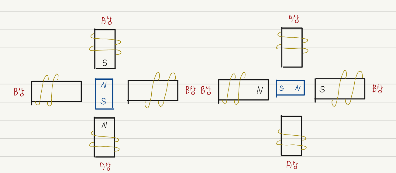 왼쪽을 보시면 A상의 Stator에 감겨있는 코일에 전류를 흘려줍니다. 이렇게 될 경우 Rotor가 그림의 위치처럼 고정이 되게 됩니다.