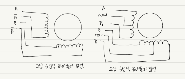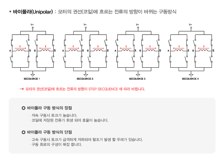 코일에 전류가 한쪽 방향으로만 흐르면 유니폴라, 양쪽 방향으로 교차로 흐르면 바이폴라라고 합니다.