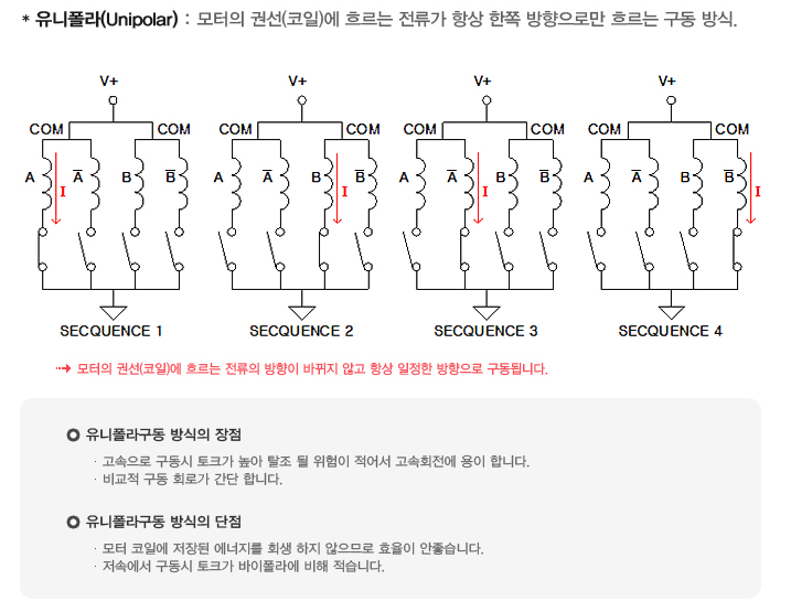 스텝 모터의 구동 방식에는 유니폴라(uni-polar)와 바이폴라(bi-polar) 구동 방식이 있습니다.