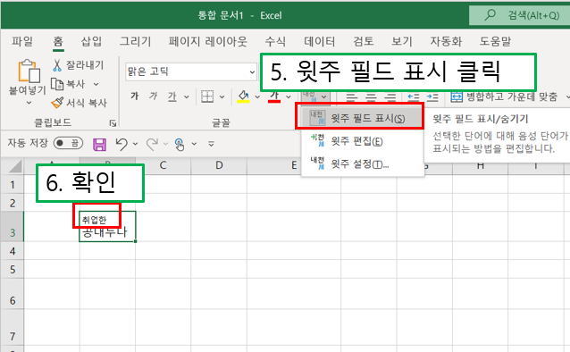 (2). [글꼴] 그룹에서 [윗주 필드 표시/숨기기]의 아래 화살표 모양을 클릭합니다.