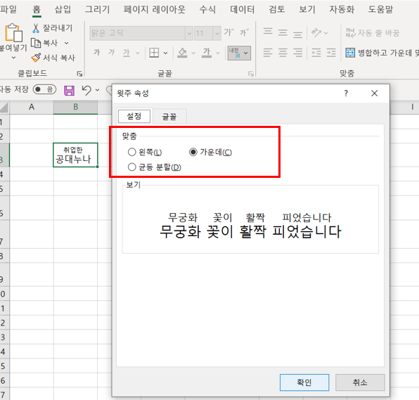 저는 공대누나라는 글이 입력된 셀의 윗주로 취업한을 설정해 보도록 하겠습니다.