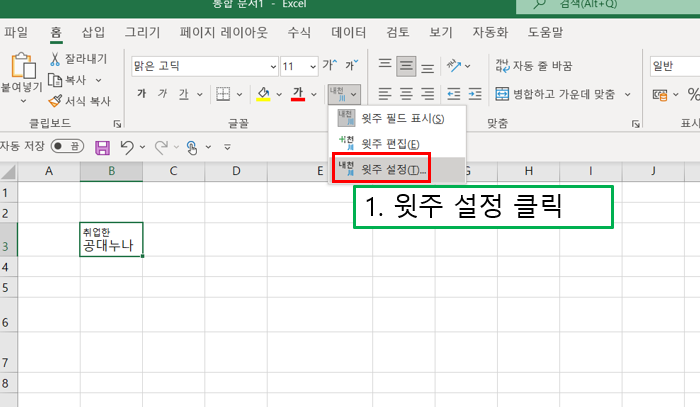 (1). 다시 그 아래 화살표를 누르고 [윗주 설정]을 클릭합니다.