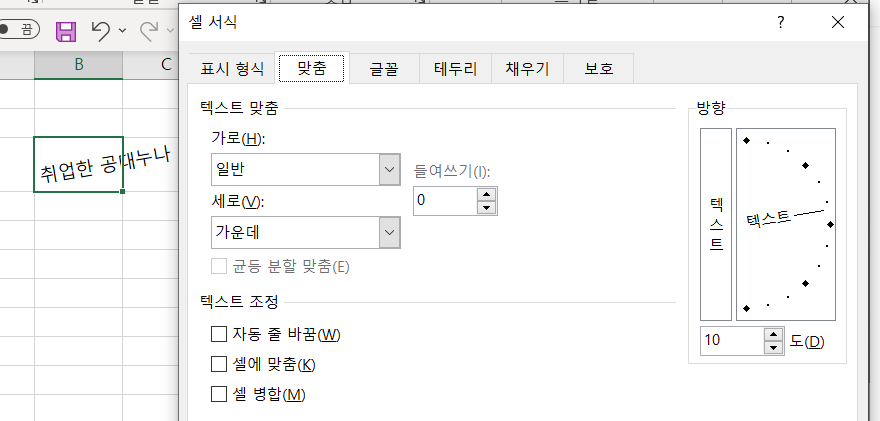 [방향]의 [셀서식맞춤]을 들어가시면 되는데요.