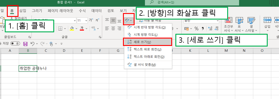 엑셀에서 문서 작업을 하다 보면 셀에 글자를 세로로 입력해야 할 때가 있습니다.