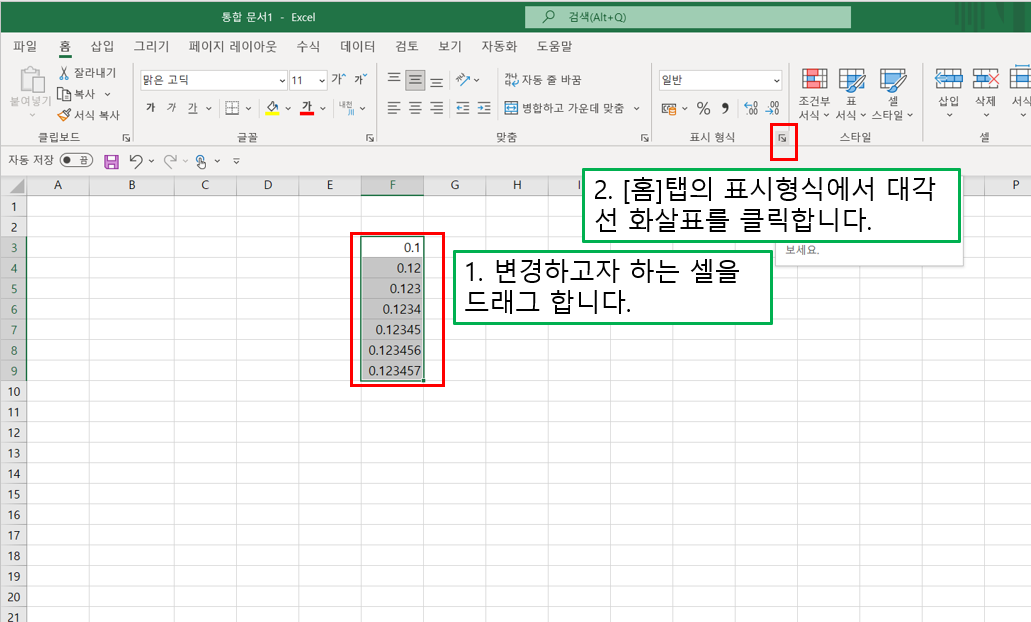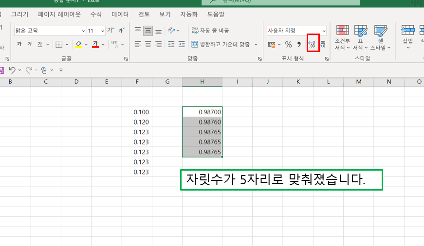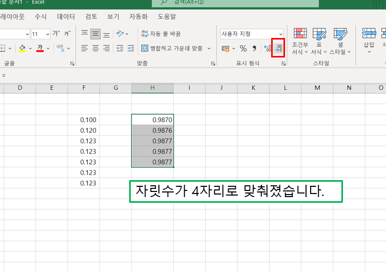 그리고 아래 그림을 참고하여 [표시 형식]의 자릿수 늘림 아이콘을 클릭합니다.