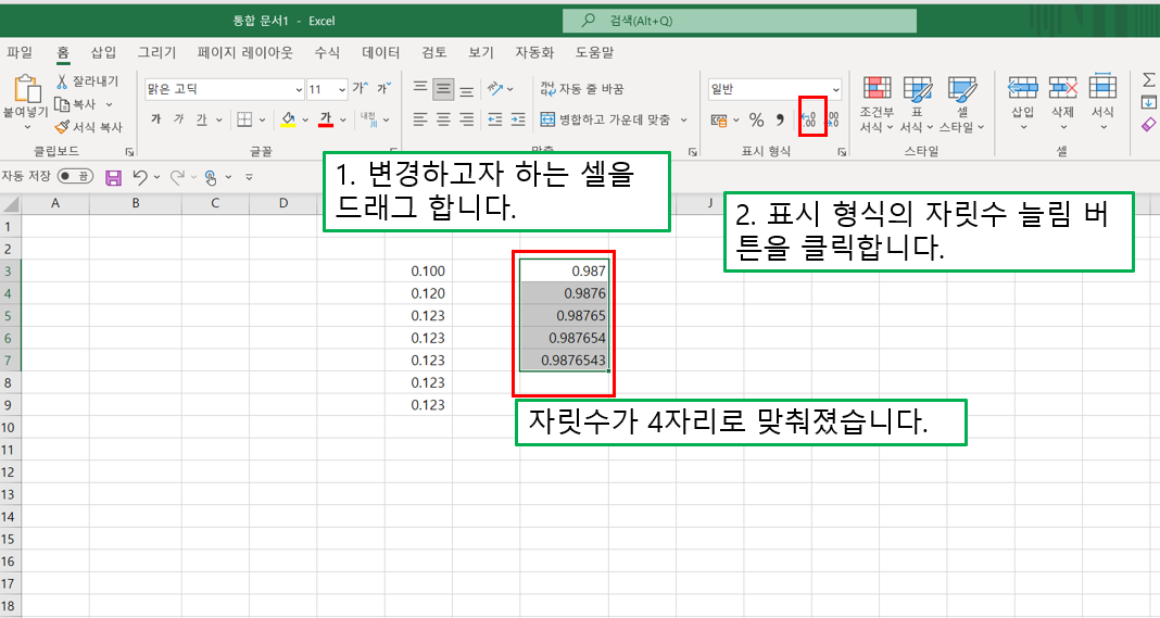 2. 자릿수 늘림/자릿수 줄임 아이콘 이용하기