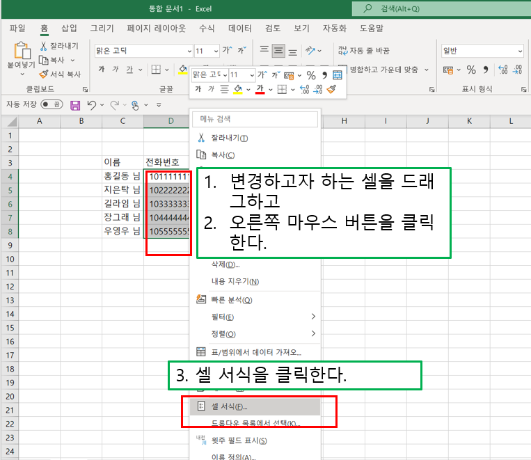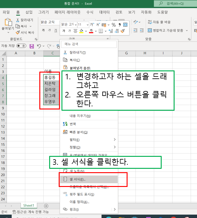 1) 변경하고자 하는 셀을 드래그하여 선택합니다.