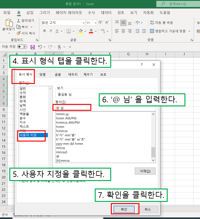 *@는 셀에 입력된 문자를 의미합니다. 그래서 @ 님 이라고 입력하면 셀에 입력된 문자 + 님 이라는 글자가 표기되는 것입니다.