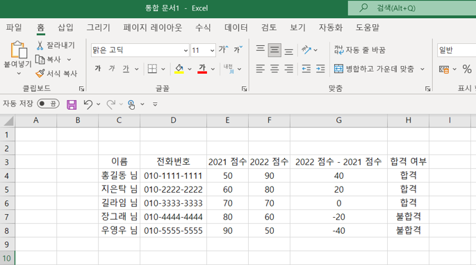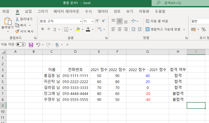 아래 표에서 G열의 점수가 양수이면 색상을 파란색으로, 음수이면 색상을 빨간색으로 표시해보도록 하겠습니다.