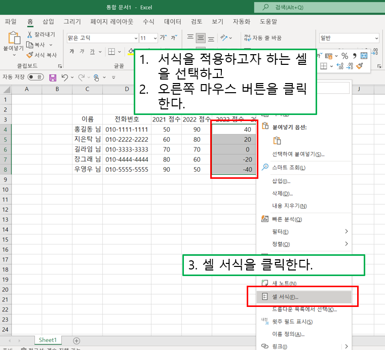 오늘은 여러 개의 표시 형식을 한꺼번에 지정해보도록 하겠습니다.