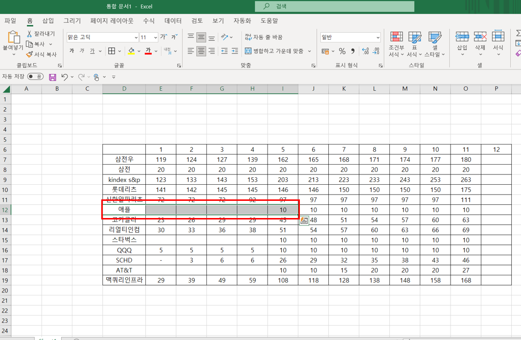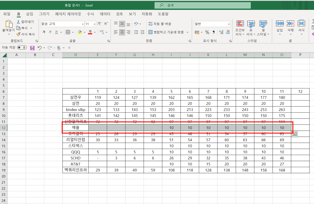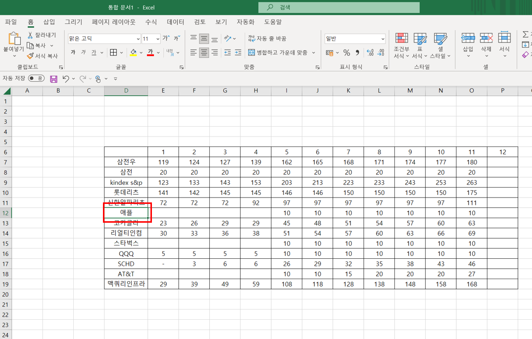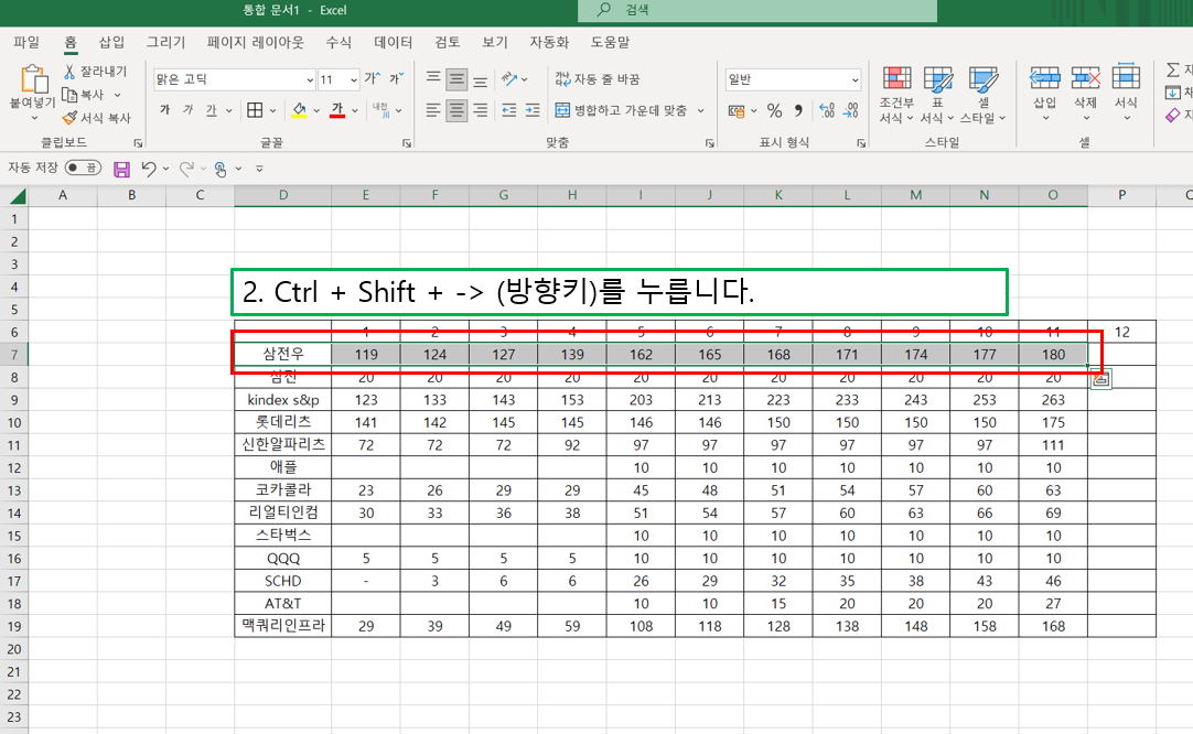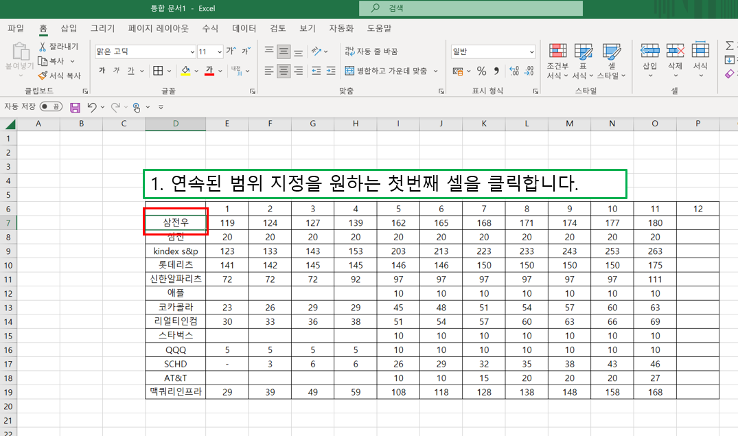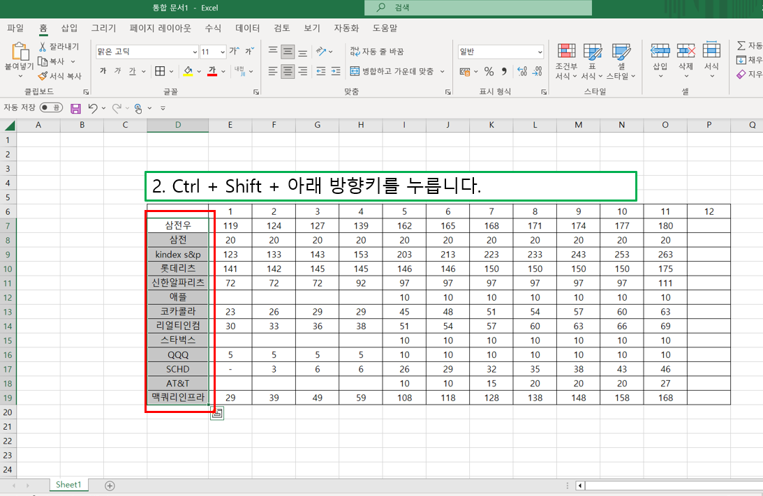 그렇다면 이번에는 주식 목록인 D7부터 D19를 연속적으로 선택하고 싶습니다.