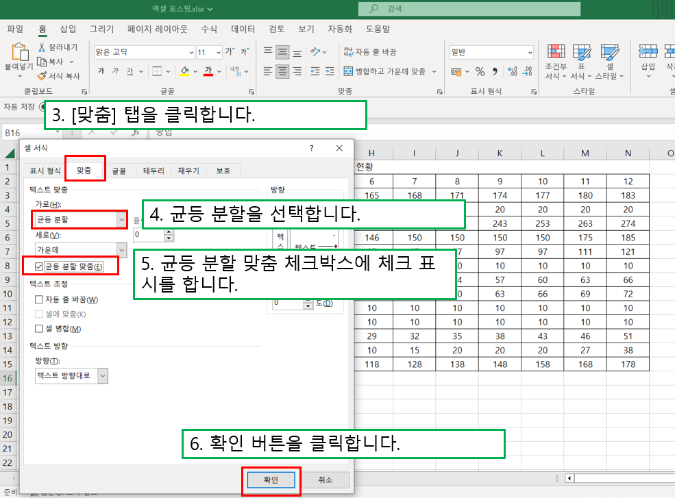 셀 서식 -> 맞춤 -> 가로-균등분할 -> 균등 분할 맞춤 체크