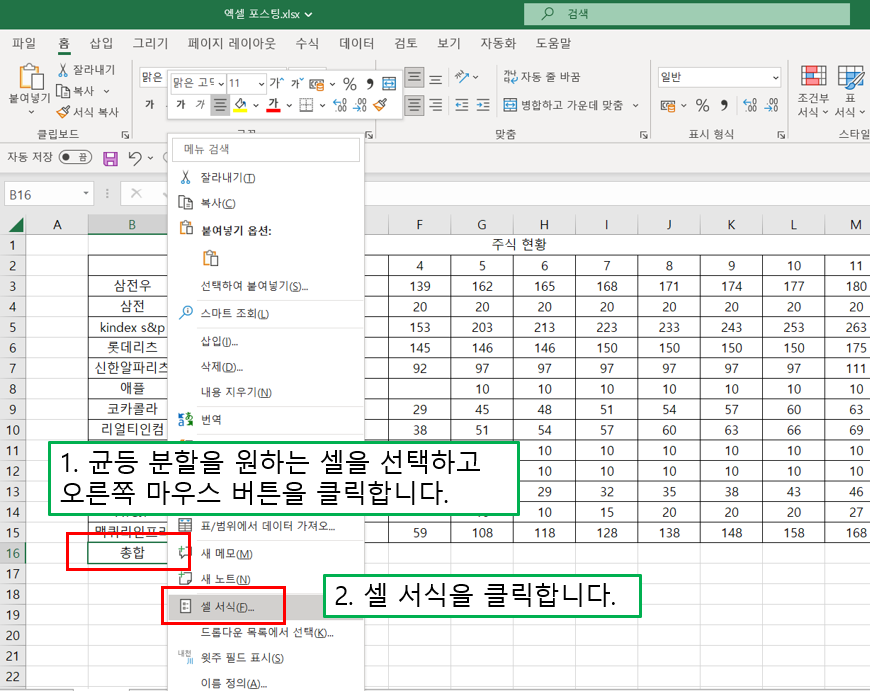 1. 균등 분할을 원하는 셀을 선택하고 오른쪽 마우스 버튼을 클릭합니다.