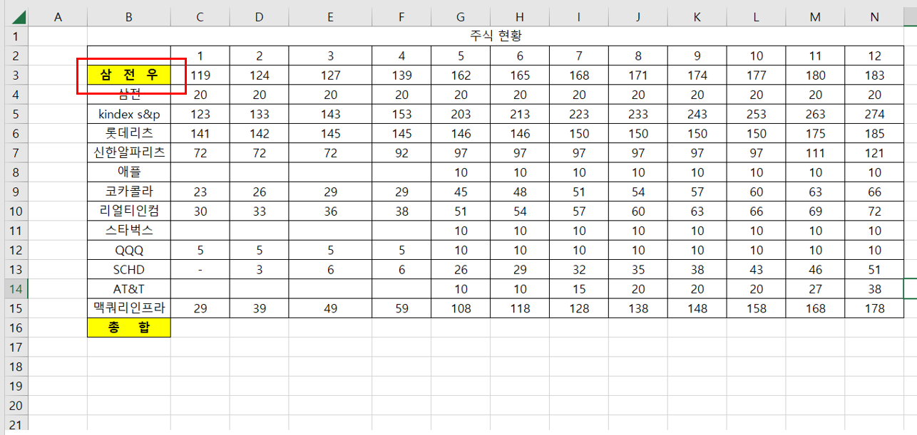 저는 삼전우 셀을 선택했는데 균등 분할, 노란색 배경, 굵은 글씨체가 잘 적용이 된 것을 알 수 있습니다.