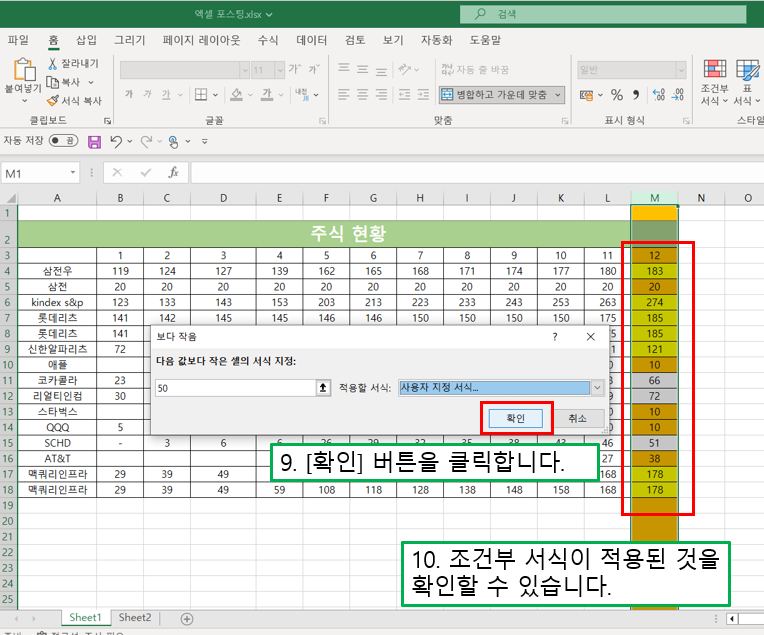 10) 조건부 서식이 적용된 것을 확인할 수 있습니다.
