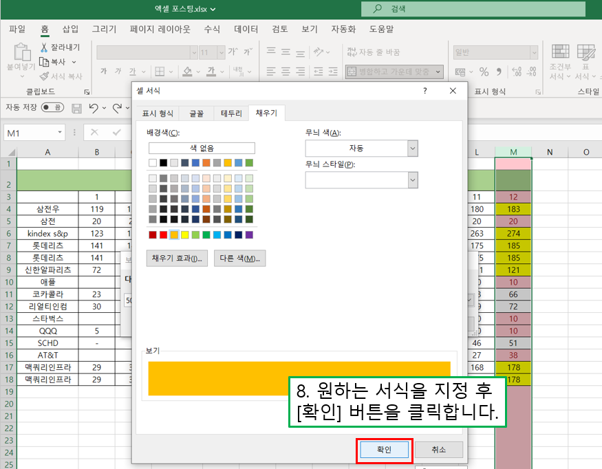 8) 원하는 서식을 지정 후 [확인] 버튼을 클릭합니다. 저는 채우기에서 주황색 채우기를 지정했습니다.
