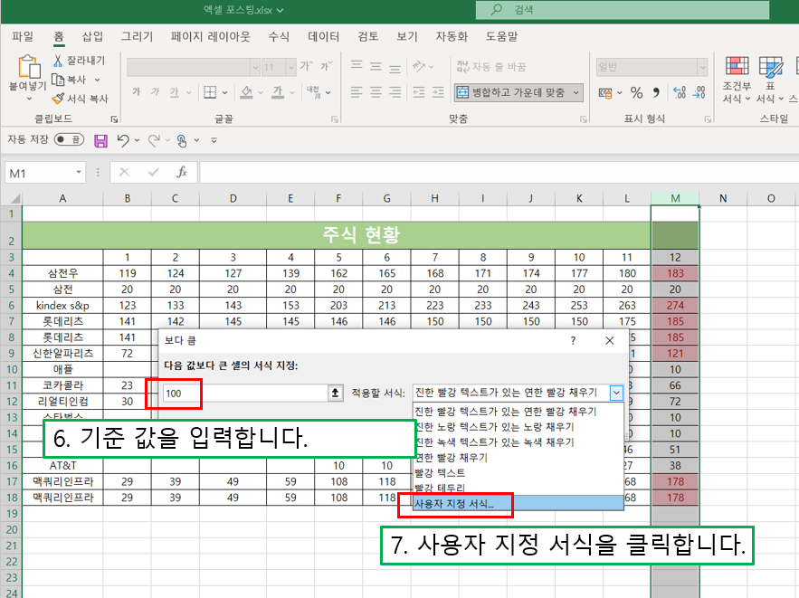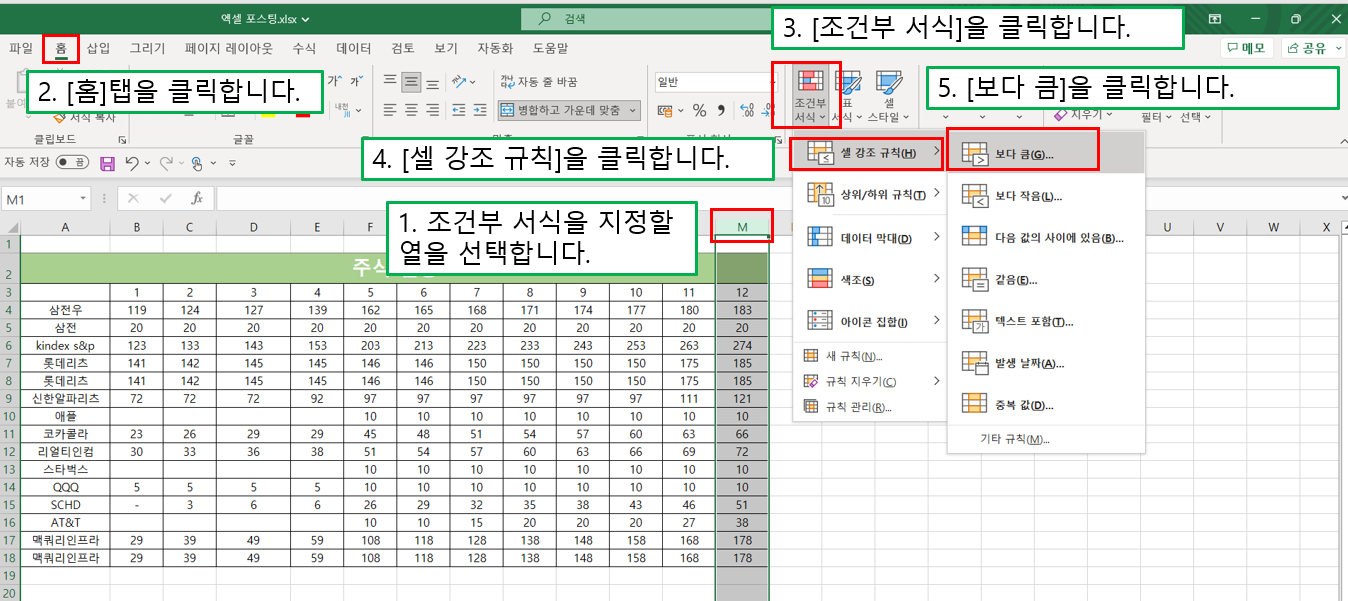 1) 조건부 서식을 지정할 열을 선택합니다. 저는 M열에서 주식 수가 100 초과인 열들의 서식을 노란색 배경으로 바꿔보려고 합니다.